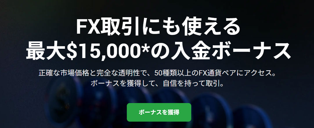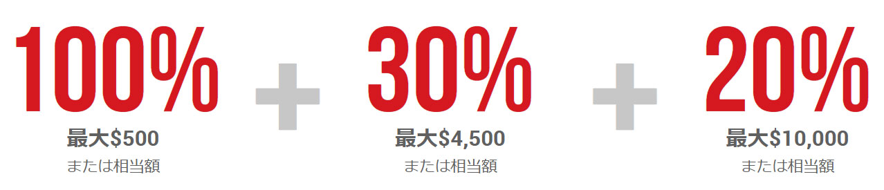 入金ボーナスは最大$500まで100%、最大$4,500まで30%、最大総計額$15,000まで20%の3段階式ボーナスです。